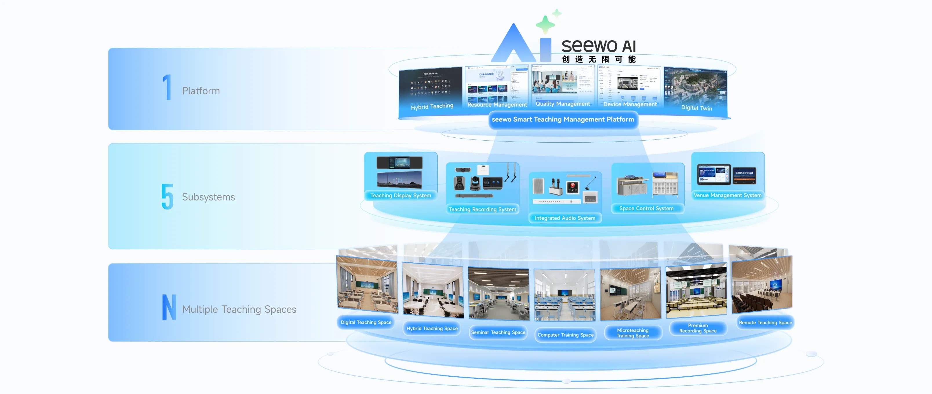 1 Smart Management Platform, 5 Subsystems, enabling multiple types of teaching spaces