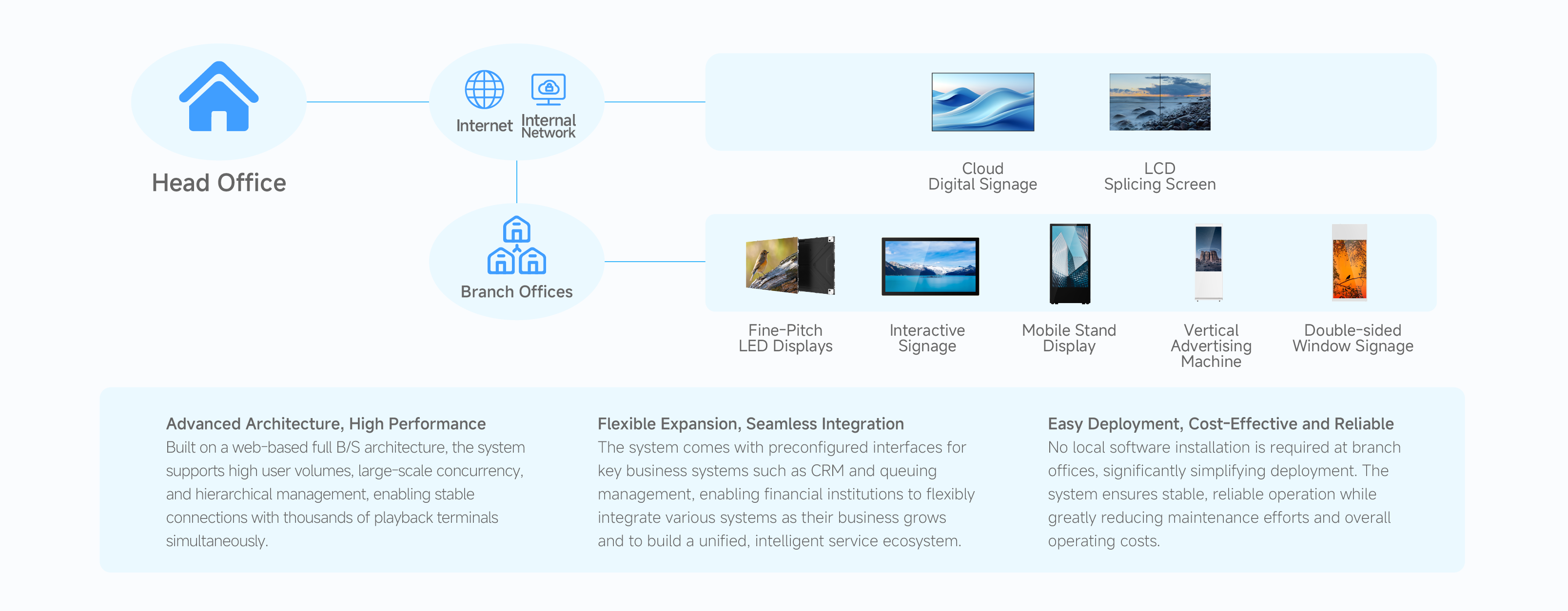 Through advanced digital commercial display systems, this solution provides an all-in-one intelligent display platform tailored for diverse financial scenarios. It enhances customer experience, streamlines branch operations, and drives digital transformation across banks, insurance institutions, and other financial sectors.