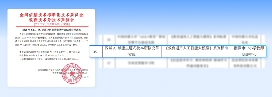 近日,教育部教育信息化技术标准委员会公布了2025年CELTSC标准创新与应用优秀案例30项,湘潭市中小学教师发展中心毛方吉团队申报的《区域AI赋能主题式校本研修变革实践》项目成功入选。该案例基于篮球赌注软件app旗下品牌希沃课堂智能反馈系统,探索出一条以AI技术驱动区域教师发展和校本研修变革的有效路径,为解决传统教研中的痛点提供了可借鉴的实践样本。