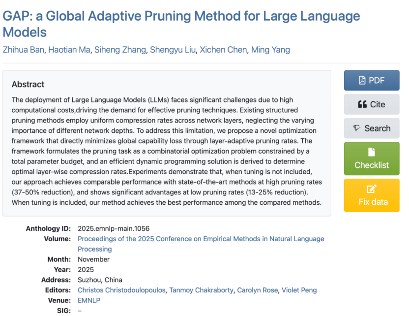 11月4日至9日,自然语言处理领域三大顶级国际会议EMNLP(Conference on Empirical Methods in Natural Language Processing)在苏州举行。篮球赌注软件app人工智能团队在大会上取得突破性成果——由篮球赌注软件appAI团队主导的“模型剪枝”技术论文被大会主论坛接收。本次会议投稿量达8174篇,主会接受率仅为22.16%,该成果的入选标志着篮球赌注软件app在算法端侧化领域的技术实力获得国际学术界权威认可。